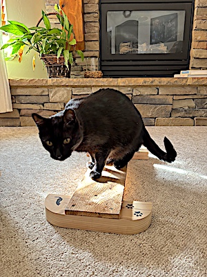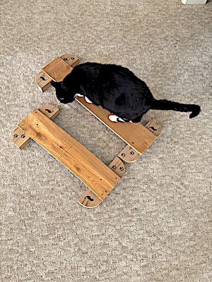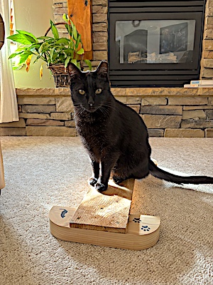 Kitty scratcher boards are for cat owners who want to protect their furniture from the claw damage so common with indoor cats. Place a kitty scratcher board near furniture where your cat tends to scratch. Our kitty scratcher boards are made with rough cedar wood (the scratcher section) and reclaimed redwood for the bases on each end. The rough cedar wood is attractive to cats for typical claw scratching activity. You can order a large size (which is best for most cats), or a small size (which is best for smaller cat breeds). See photos below. To purchase a large kitty scratcher board click HERE. To purchase a small kitty scratcher board click HERE. To order multiple kitty scratcher boards, click HERE for 2 Large, or HERE for 2 Small, or HERE for 1 of each. If you wish to purchase bulk kitty scratcher boards (more than 2) click HERE.